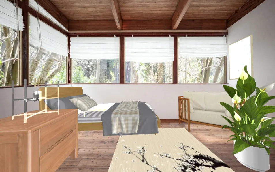 A small cottage bedroom in the middle of a quiet forest full of creatures.