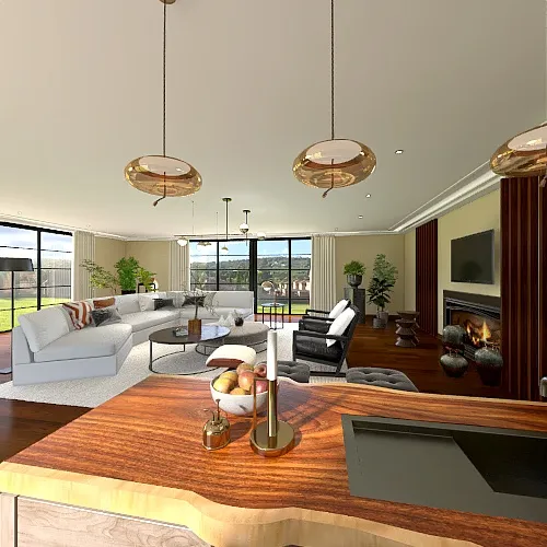 This is an open concept living room with a kitchen and a dining room. The inspo is japandi, mid-century, chocolate fall colors, lots of lighting.