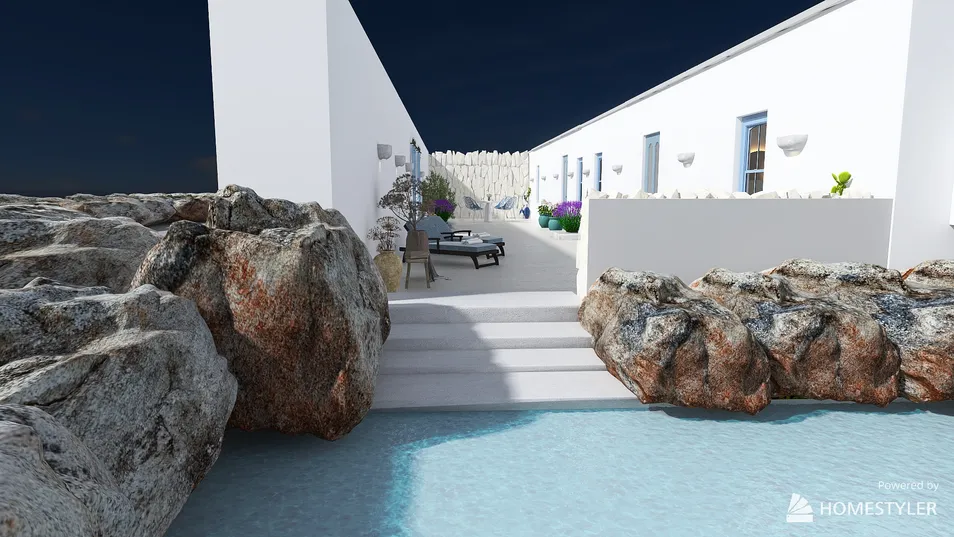KATIKIA est une petite maison grecque ; les murs sont blanc et la décoration est composé de bleu;elle est composé d' une pièce de vie avec une cuisine et un salon ;des marches sont présente dans cette maison ;elle a une chambre et une salle de bain . l' extérieur a une grande entrée qui donne sur une cour ou se trouve une piscine naturelle