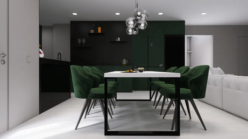 The kitchen walls are in light colors, but with dark accents. The kitchen modules are made in emerald color Accent dark colors in the working area of the kitchen. Green accent wall with dark slats and white furniture in the TV area. Added white floor length curtains to create more warmth and coziness.