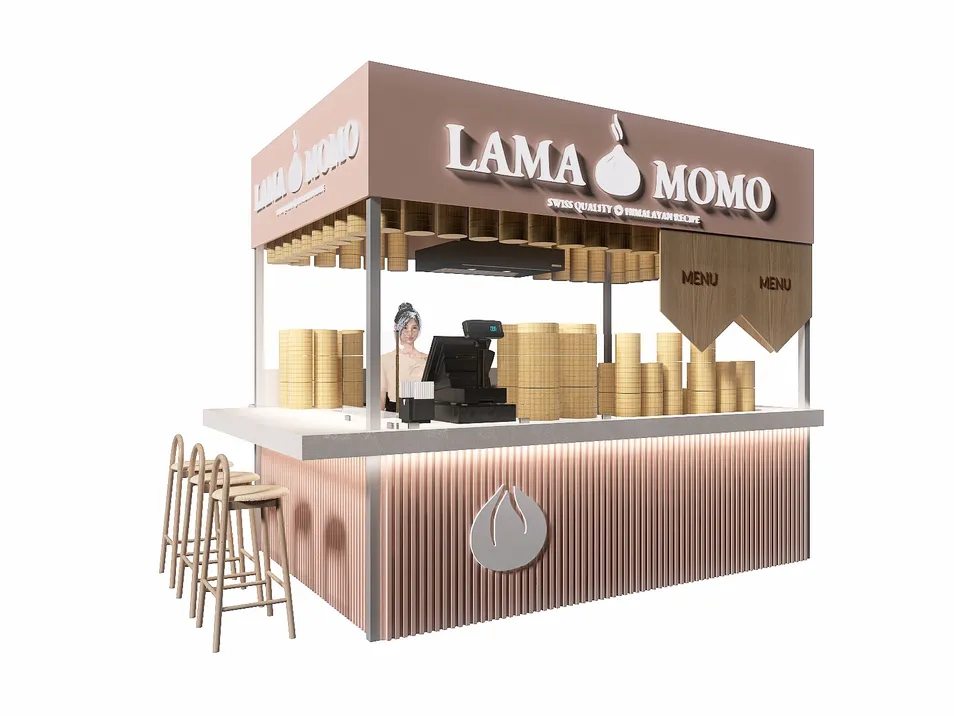 LAMA MOMO es una tienda de dumplings asiáticos conocida por sus cestas decorativas al vapor. El objetivo era crear una identidad de marca que se alineara con la estética y el estilo gráfico de la tienda que ya viene con un diseño marcado, a la vez que hiciera que el espacio fuera funcional. En este caso, el espacio del centro comercial era muy limitado, pero desarrollamos un diseño que funcionó a la perfección.