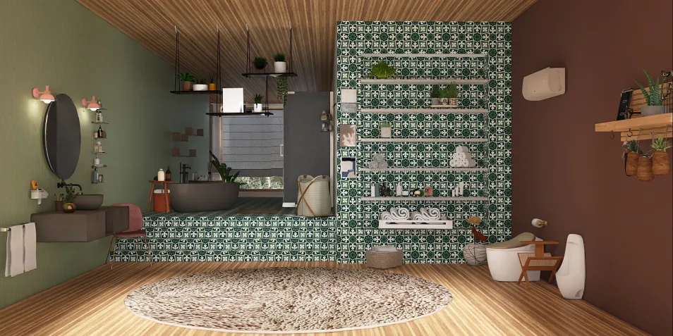Large bathroom with 2023 trendy colors. You can relax in the bath tube or take a quick shower, but the atmosphere is the same. Enjoy colours