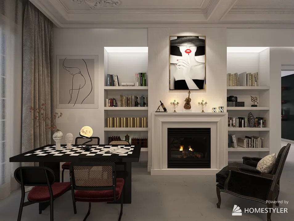 I thought of a relaxing place where people can choose a book and sit in the armchair in front of the fireplace to read, or they can play chess. The style predominantly is Bauhaus - black and whit with little toutches of color.