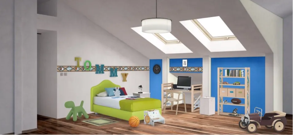 The bright blue and green colors are the focal tones that pop as soon as you are faced in the room. The wood tones on the entertainment pieces are the perfect cool shade to compliment the eye catching main colors that tie the room together. Last, it wouldn’t be a kids room without lots of toys neatly placed around to give you the sense that the room is actively in use and to feel like Tommy is really there.