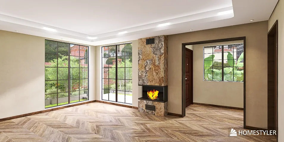 An empty living room, bathed in soft light, offers a canvas of possibilities. The herringbone floor whispers stories of footsteps yet to come, while the stone fireplace stands as a silent guardian, waiting for warmth and laughter to fill its space.