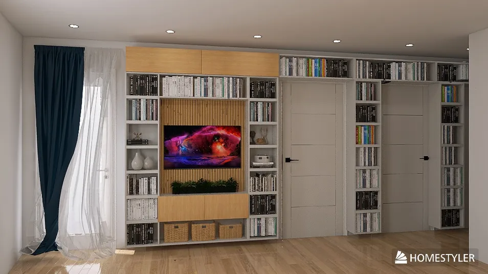 Following my client's wishes, I created this custom entryway wardrobe and a media unit. With a narrow space, it was challenging to fit all their (family of five) needs into a functional yet modern and stylish wardrobe. Also, as they do have a lot of books and not enough space in the bedrooms, I have made a media unit with an extensive bookshelf for all their books.
