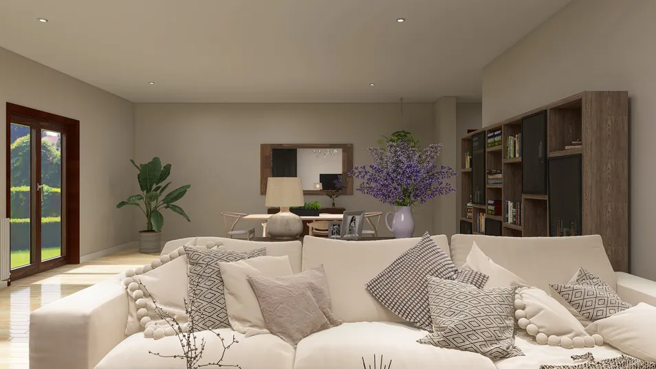 Esta casa me la propuso un cliente y la verdad es que sólo cambiamos algunos elementos. Le quise dar intensidad a la pared de la chimenea para así crear un ambiente todavía más acogedor. Las tonalidades de la alfombra también contribuyen a crear ese ambiente cálido que queremos ya que es un chalet en plena sierra de Guadarrama.