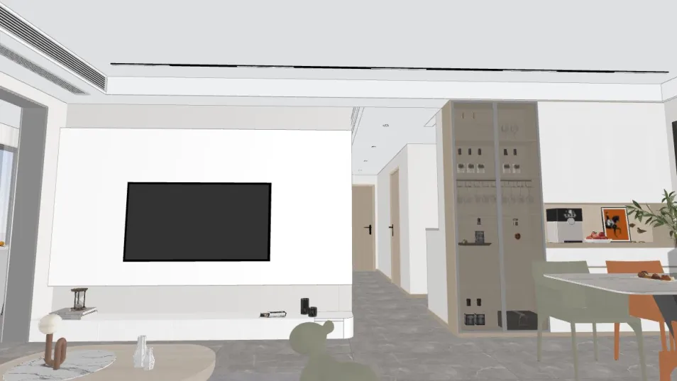 In questo spazio, dove il bianco abbraccia il grigio, il divano verde sembra un accenno di vita in un regno di silenzio. La TV, come un occhio senza sguardo, osserva un mondo di conversazioni non dette, mentre l'eleganza del design si fa beffe della banalità dell'esistenza.
