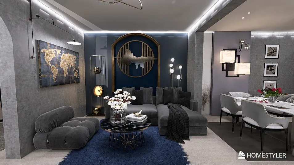 The deep blue walls create a bold yet calming atmosphere.A modern, elegant aesthetic design with a blend of luxury and comfort.An open-plan layout seamlessly connects the living, dining, and kitchen areas. The overall design balances functionality and elegance.