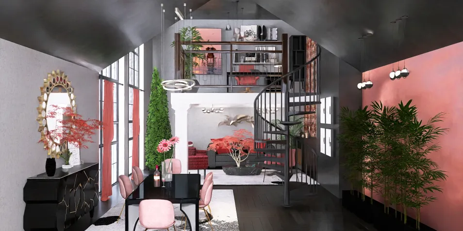 Utilice paleta de colores de los rojos combinados con gris y negro, dándole elegancia. Logre conseguir tres ambientes en el mismo espacio!