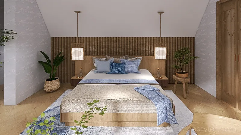 I have included some elements of Japandi style in this Master Bedroom. Client wanted bring outside in. As the bedroom is on the top floor of the family house I have introduced blue colour to reflect the colour of the sky.
