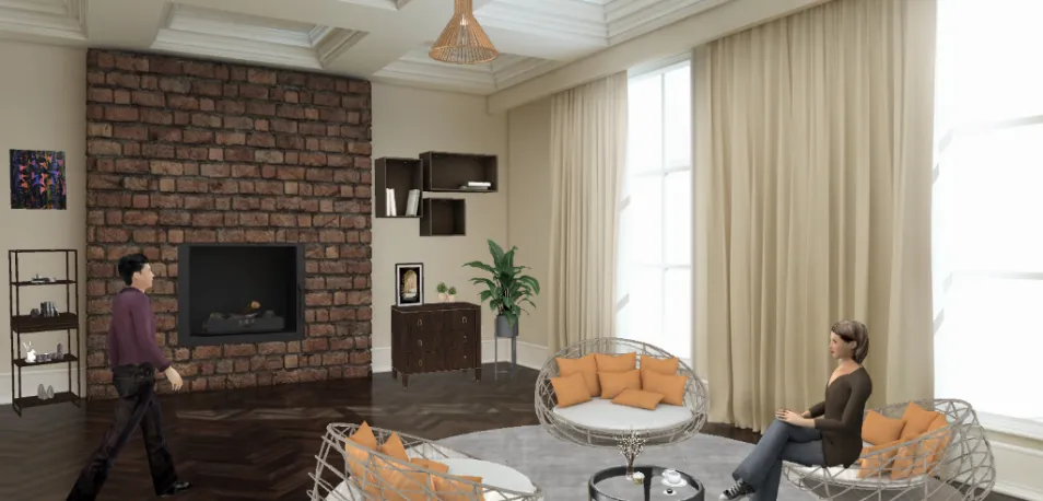 Sala de estar com lareira. Móveis minimalista.