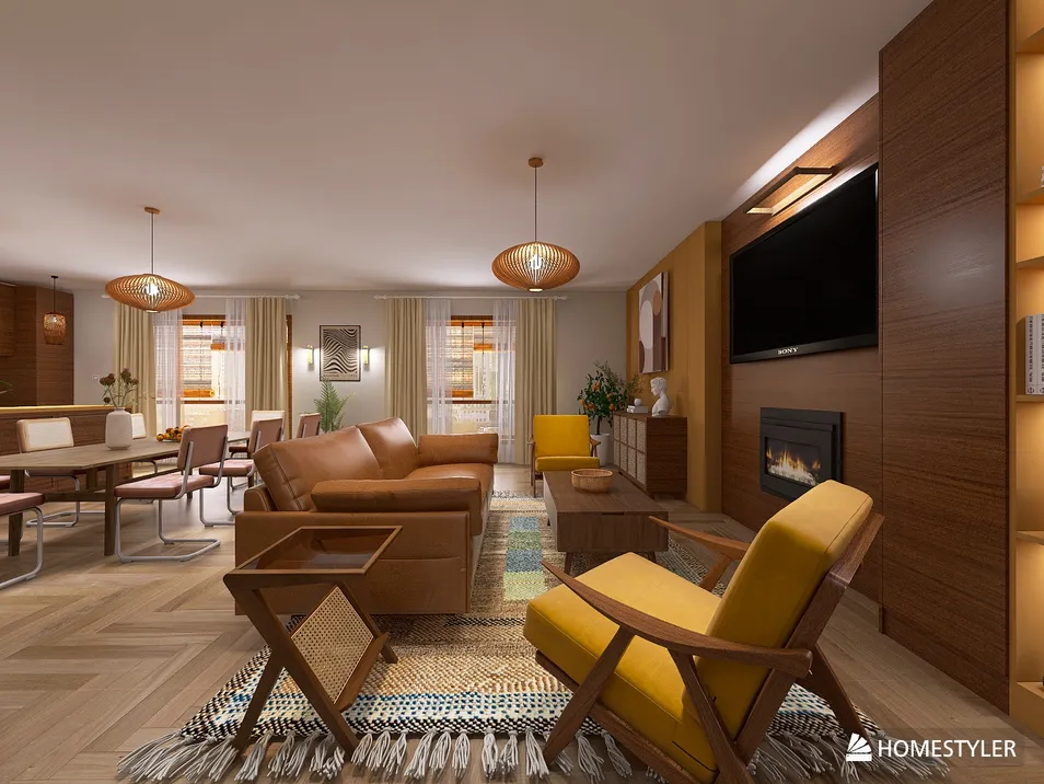 The midcentury modern apartment exudes a harmonious blend of warmth and style, featuring a soothing beige backdrop that perfectly complements the vibrant orange and yellow accents scattered throughout the space. Dark wood furnishings add depth and sophistication, creating a cozy yet chic atmosphere. Sunlight filters through large windows, illuminating the carefully curated decor that balances retro charm with contemporary sensibilities.