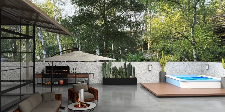 Step onto a modern back porch where sleek lines meet natural serenity. A minimalist pool glistens under the sun, while potted cacti stand sentinel beside a stylish outdoor kitchen. This space invites both relaxation and vibrant gatherings, blending contemporary design with the tranquility of nature.