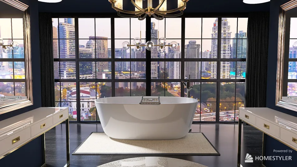 This is a Modern Bathroom with a city view. Modern Bedroom: https://www.homestyler.com/projectDetail/62f641da4c12ba09918f2d06?spm=a1zmxy.17753976.0.0.6faf562eUTJ0lG