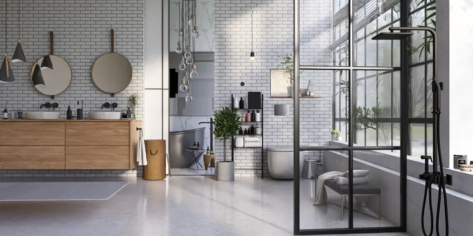 This serene space features sleek lines and natural materials. The large windows invite in light, while the minimalist fixtures offer functionality without excess. Each detail, from the wooden cabinetry to the glass accents, creates a harmonious blend of comfort and elegance.
