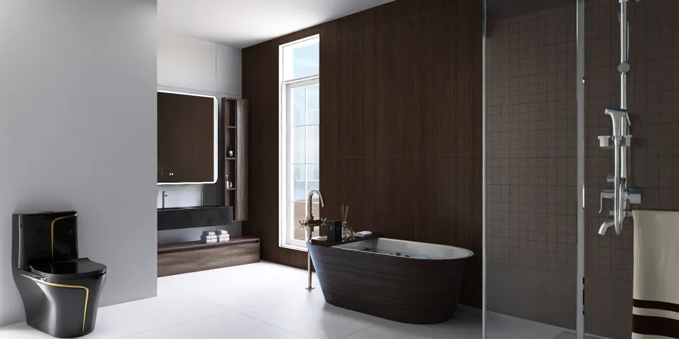 In this sleek sanctuary, dark wood meets pristine white tiles, creating a tranquil contrast. The freestanding tub invites relaxation, while the minimalist fixtures whisper sophistication. A perfect blend of form and function, this space promises rejuvenation in every detail.