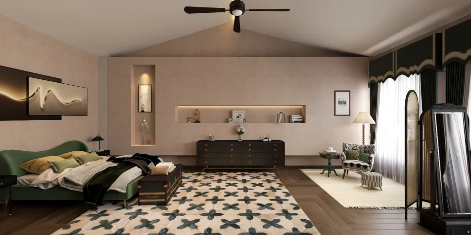 Where modern meets cozy 🤍 Layered textures, soft neutrals, and rich green tones create a bedroom that feels calm, refined, and intentionally designed.