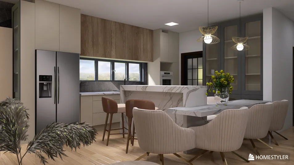The kitchen flows seamlessly into the living area, where earthy tones meet sleek lines. Natural light pours in, illuminating the marble countertops and soft textures of upholstered seating. A blend of functionality and style, this space invites both gatherings and quiet moments of reflection.