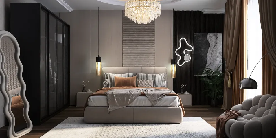 In this serene bedroom, soft textures blend with sleek lines, while the chandelier casts a warm glow, whispering secrets of comfort. A plush bed awaits, inviting dreams, as shadows dance playfully on the walls, hinting at stories yet untold.
