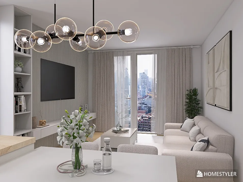 In a minimalist space where light dances through sheer curtains, every detail whispers sophistication. The seamless blend of sleek cabinetry and inviting textures beckons one to linger, while the panoramic city view serves as a silent witness to the stories shared within these walls.