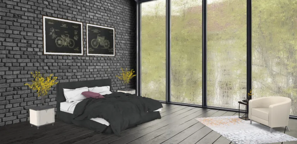 Modern, industrial master bedroom with an elegant, yet simple seating area overlooking the neighborhood park. *All descriptions are purely fictional and do not represent actual locations.