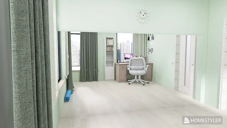In this space, delicate shades of green embrace the light, creating a cozy and peaceful atmosphere. Textured fabric curtains drape softly, and minimalist furniture blends with the city skyline, inviting you to enjoy coffee and breakfast amidst the towering buildings. ... В этом пространстве нежные зеленые оттенки обнимают свет, создавая атмосферу уюта и спокойствия. Шторы из текстурированной ткани мягко драпируются, а минималистичная мебель сливается с городской панорамой, словно приглашая на кофе за завтраком среди высоток.
