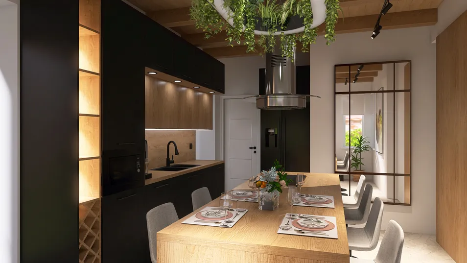 In a harmonious blend of natural wood, this kitchen invites wine lovers and large families to gather. The beamed ceiling and ample light create a welcoming atmosphere, where every detail enhances the joy of shared moments and culinary adventures.