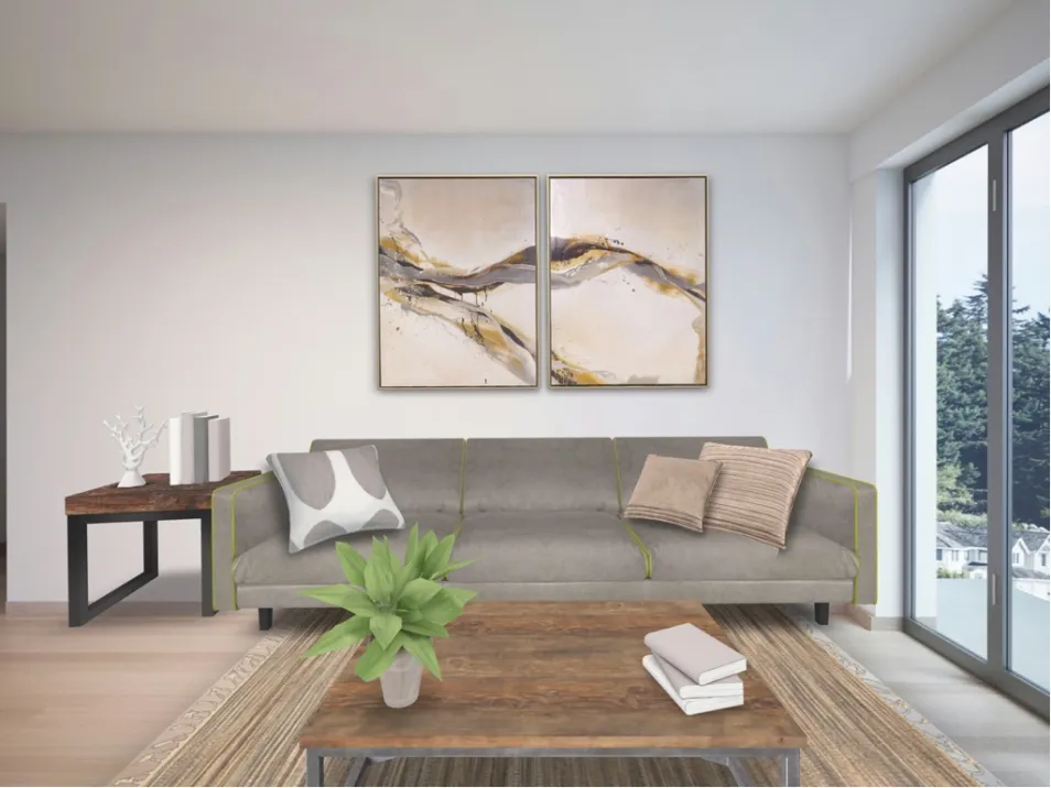A modern look, casual furniture with a nice view. Accessories placed, but not at random. The plant in the room gives life the the room. While the color pallet is neutral. Some wood.