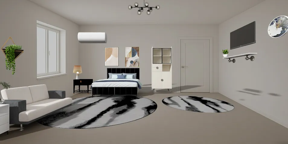 This bedroom embraces simplicity with clean lines and a neutral palette. The circular rugs add a touch of softness, contrasting with the sleek furniture. A blend of functionality and style creates a serene atmosphere, perfect for relaxation.