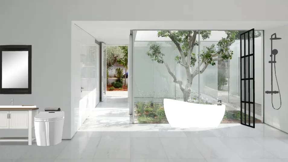 This is a modern indoor poolside bathroom. Greenery is the key!