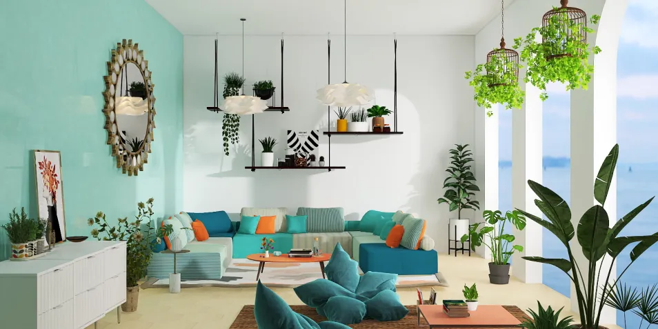 Take in the view of the ocean in this bright colorful living room with plenty of cozy seating to relax in.
