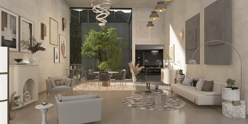In this tranquil space, minimalist design meets nature. Soft hues envelop the room, while a central tree breathes life into the open layout. The interplay of light and shadows creates a calming rhythm, inviting you to pause and reflect amidst the serene backdrop of modern elegance.