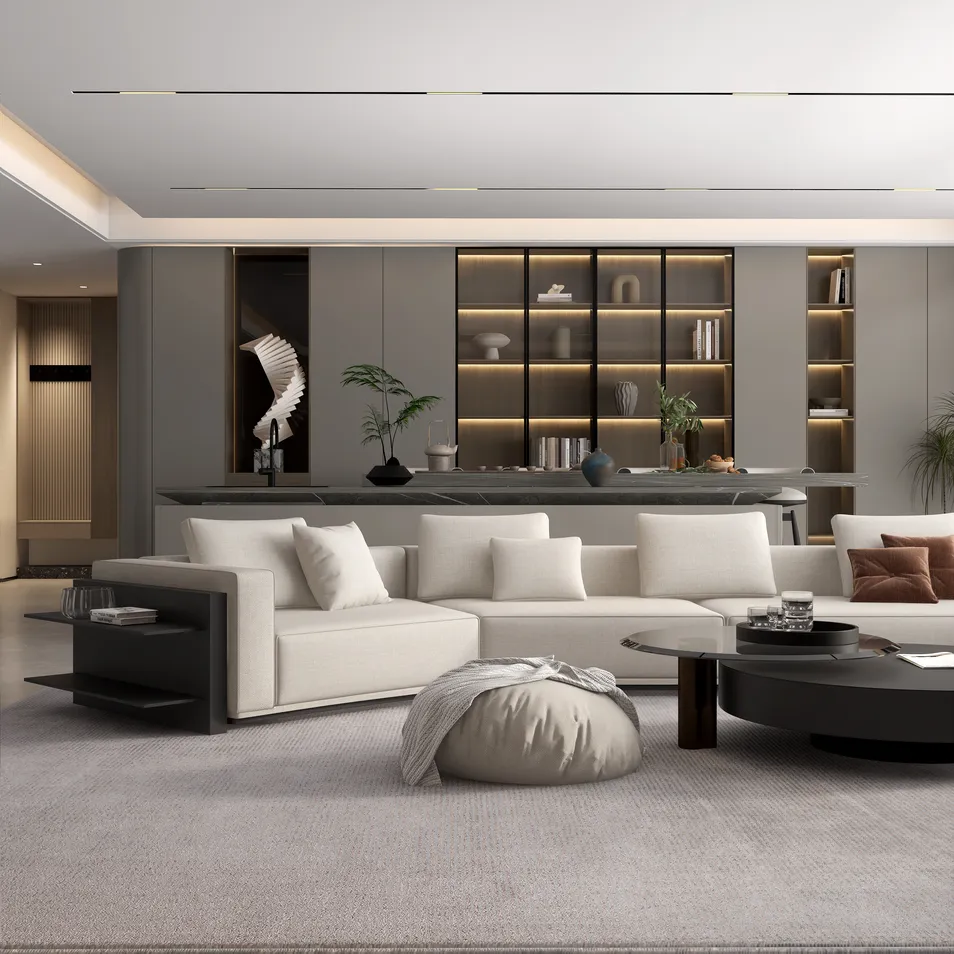 In this sleek design, muted tones embrace the tranquility of minimalism. The sunlight filters through the blinds, casting soft shadows on the polished surfaces. A single plant breathes life into the space, a reminder that even in simplicity, beauty thrives.