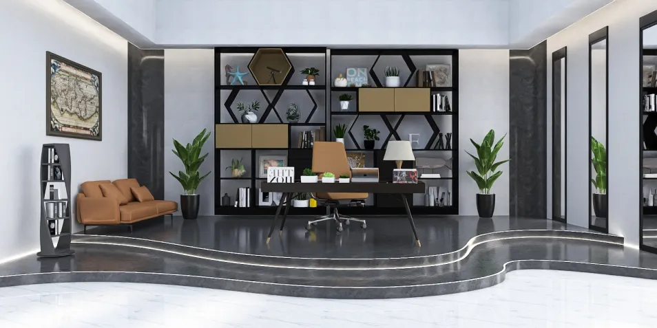 This studyingspace harmonizes sleek lines with a minimalist aesthetic. The honeycomb shelving showcases curated decor, while the soft leather sofa invites moments of reflection. A gentle curve in the floor draws the eye, creating a flow that inspires creativity and productivity.