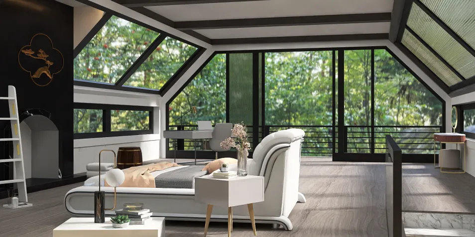 With light decor and dark bold structure this cabin bedroom has a feminist air to it accented by more dark masculine aspects created with dark colouring