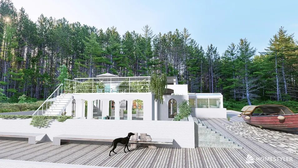 I love waterside locations and often envisage a second home looking across the bay or stretch of estuary. Somewhere restful with a garden leading down to the waters' edge. In reality I don't like gardening and the constant battle against weeds and pests. So here i have designed my low maintaince stress free garden. A semi formal terrace garden with archways and ornate pond and different areas to sit and relax in. There's a roof terrace area to take in the spectacular scenery from its raised platform and the terrace drops down to a decked area secured into the marshland.