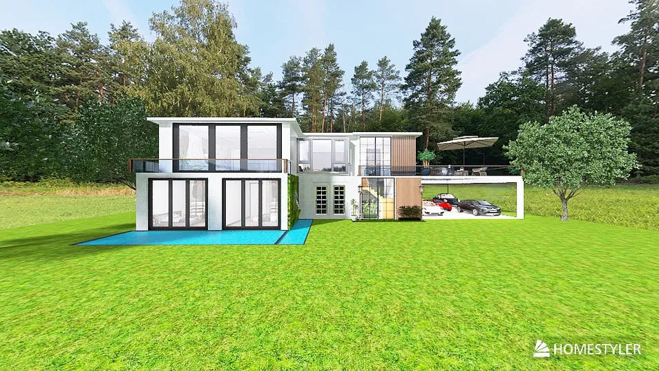 A sleek modern vacation house, nestled amidst lush greenery, showcases expansive glass walls that invite natural light and seamlessly blend indoor and outdoor spaces. The inviting pool reflects the vibrant surroundings, creating a serene escape for relaxation and rejuvenation.