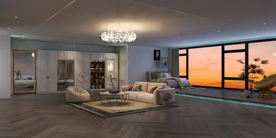 a room with a touch of pink matching the blue colors. An inviting, relaxing room, bringing a deeper idea of mental rest in the corner of the window.