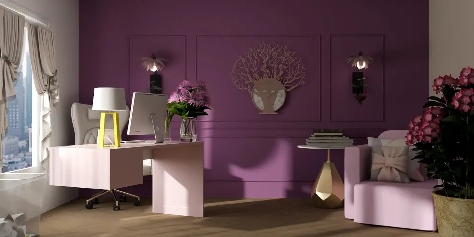 This wall color is perfect for First Day of Spring. I added this light pink to complement the wall as well as open curtains to keep that perfect lighting coming from outside. The guest chair matches the desk with a nice size potted pink flowers. it's Giving ' A welcoming area to talk about Designing for the New Season'