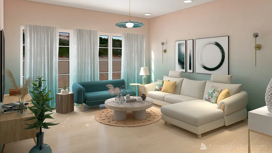 The Studio Apartment includes a Living area, bedroom, Kitchen and a bathroom. It's designed by the theme concept of an ocean and the beach. The furniture and colors used are light and minimal to give a raw and natural appearance. Living area feature wall is inspired from the beach.