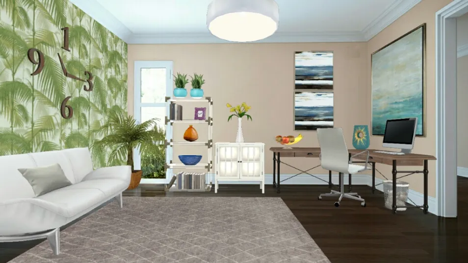 It's an office in a house. The tapestry and the plant unite together because it's important in an office to have oxygen and stimulating decor. Everything is well arranged with contemporary wooden furnitures and abstracs paintings.