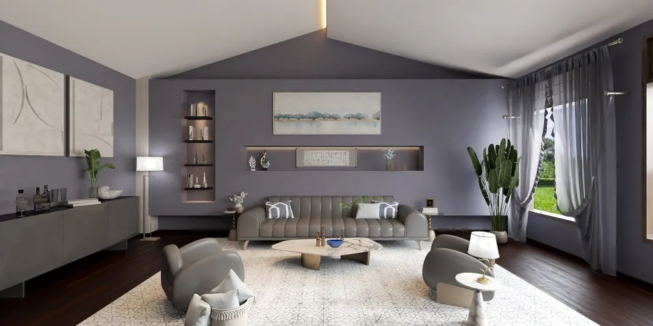 A contemporary space grounded in soft neutrals, sculptural furniture, and layered lighting for a subtle, moody finish.