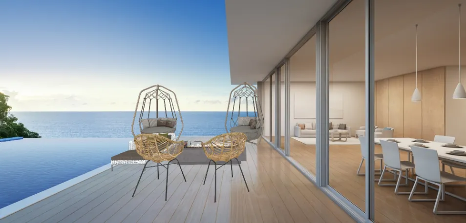 A quaint little hang out area by a fire pit. Conviently placed by the pool it is bound to be a hang out spot for the whole family.