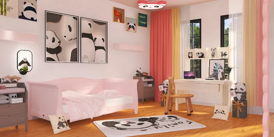 Una habitación más que todo para una niña inspirado en los animales "los pandas" con tonos blanco, negro y rosa e gris bueno para una niña:3