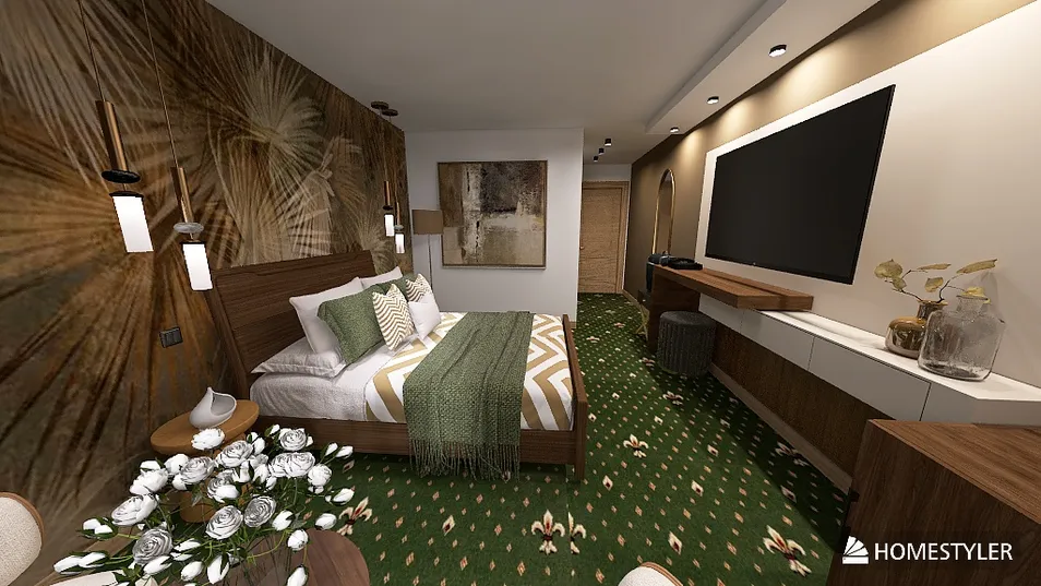 Step into a lush embrace of green, where nature whispers through textured walls. The room, adorned with soft hues and inviting curves, invites solitude. A sanctuary, perhaps, for the weary soul—a place where every detail speaks of comfort, yet leaves a lingering question: is peace merely an illusion?