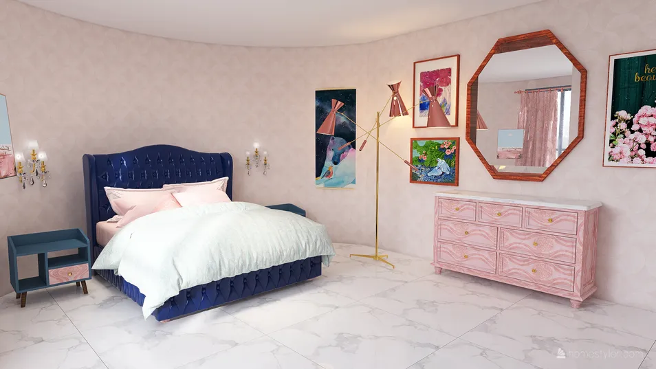 It's a girl's dream for pink! Plus if she likes any blue and gold then it will defiantly catch her eye. As you can see, there are some pics of animals and flowers. the floor is a very nice color marble and the counter top of the dresser is matching. You can see the room is tied together with many of the same colors and patterns! This is my first room design and wont be my last. Hope you enjoy!