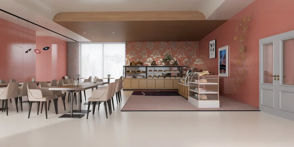 Bakery with a colorful proposal, focused on sales and socialization. Color palette: Pink and white. Padaria com proposta colorida, voltada a comercialização e socialização. Paleta de cores: Rosa e branco.