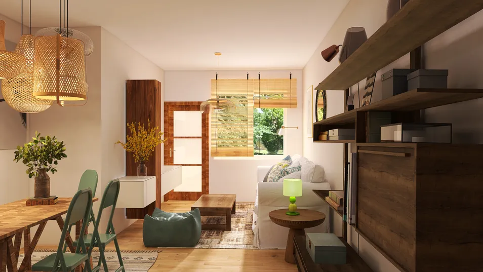 Este diseño de un pequeño piso en las afueras de Madrid presentaba mucho potencial. Se optó por el color verde por dar calma y la madera como elemento fundamental para aportar una calidez extra.