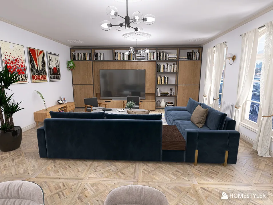 A spacious apartment in a Polish pre-war tenement building, furnished with elegance and nostalgia. The interior is decorated with distinctive corset-shaped tiles, popular in the 1920s and 1930s, adding a unique retro charm. Vintage furniture and posters complement the atmosphere of bygone times, creating a harmonious blend of historical style and modern elegance.